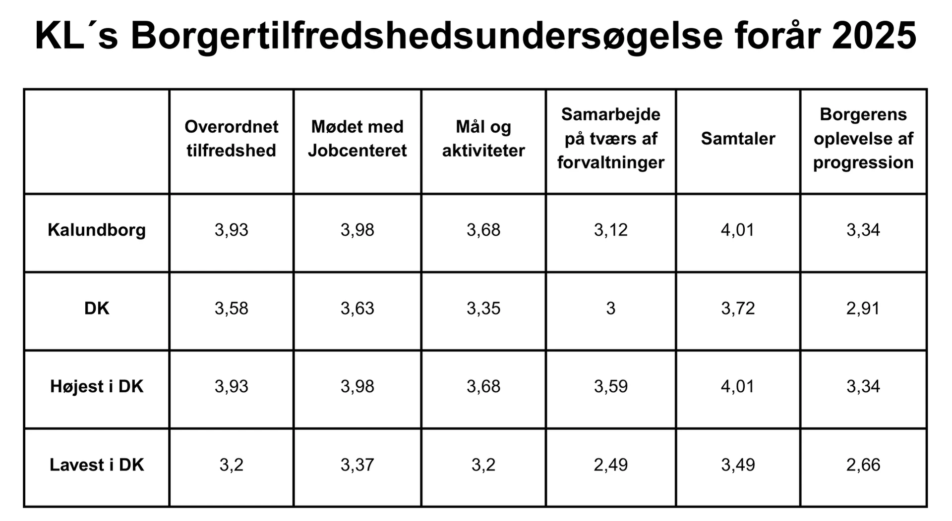 - KL´s halvårlige borgertilfredshedsundersøgelse på beskæftigelsesområdet har til formål at indsamle viden om borgernes oplevelser, tilfredshed og behov i forhold til beskæftigelsesindsatsen på tværs af forskellige kommuner.